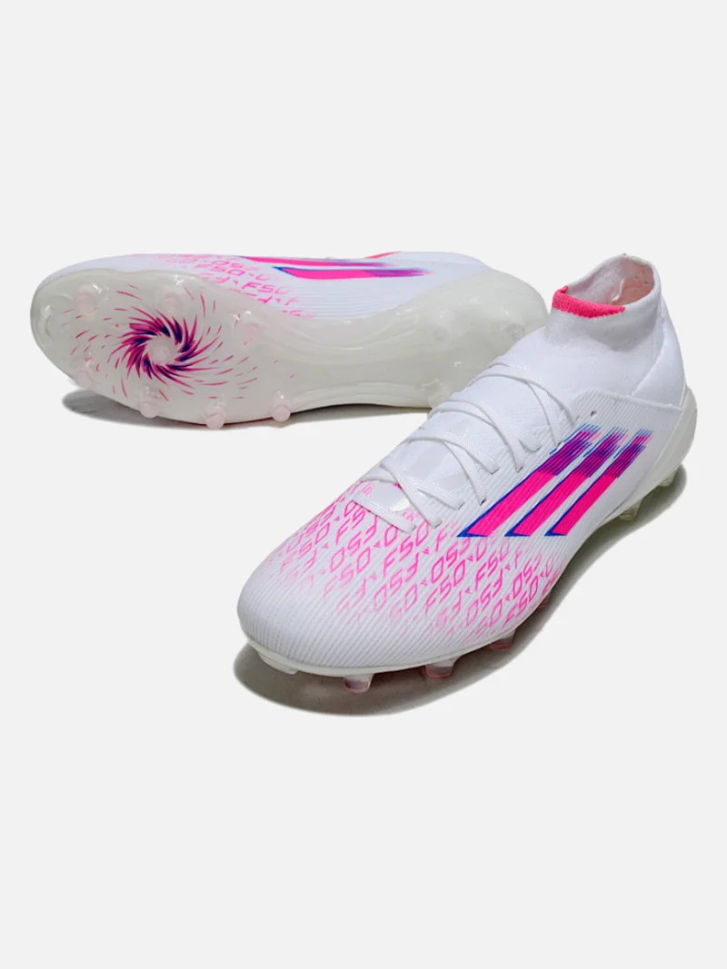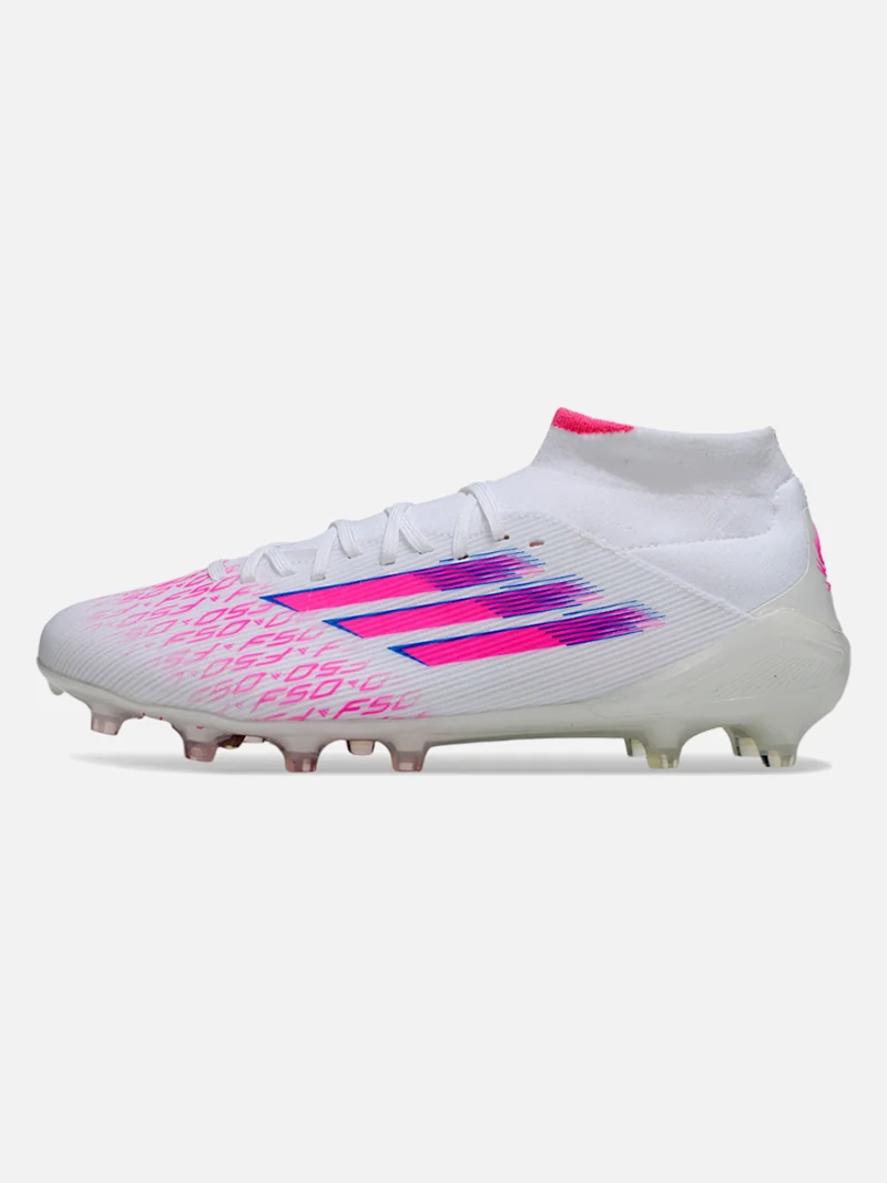 Adidas F50 Mid Elite in White and Purple—a collar that locks your ankle, uppers that respond to every touch on firm ground. Built for players who need control without sacrifice.