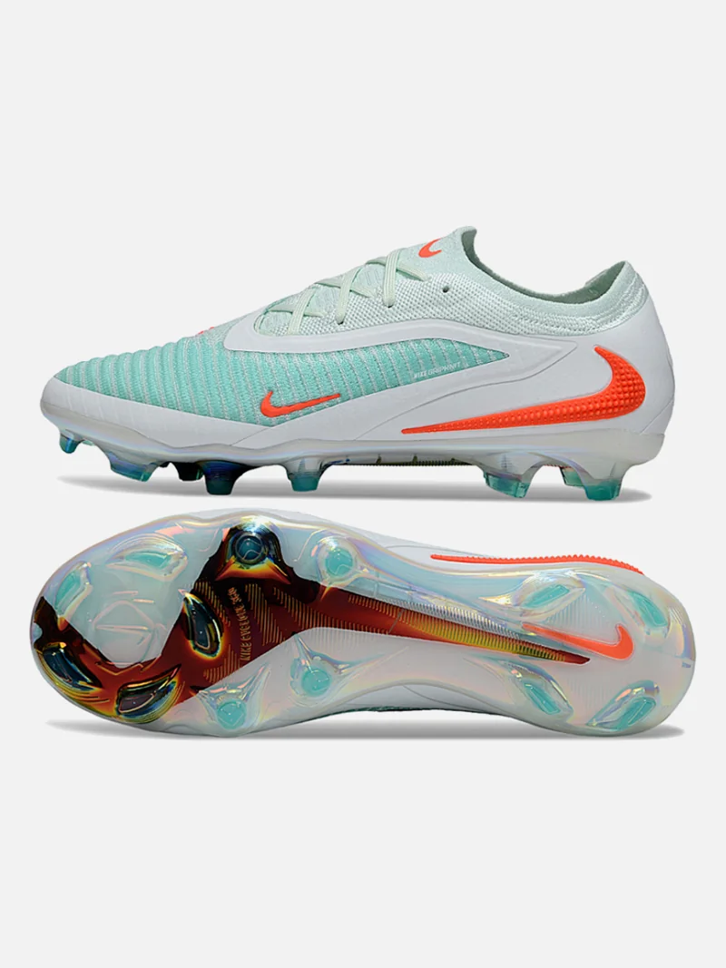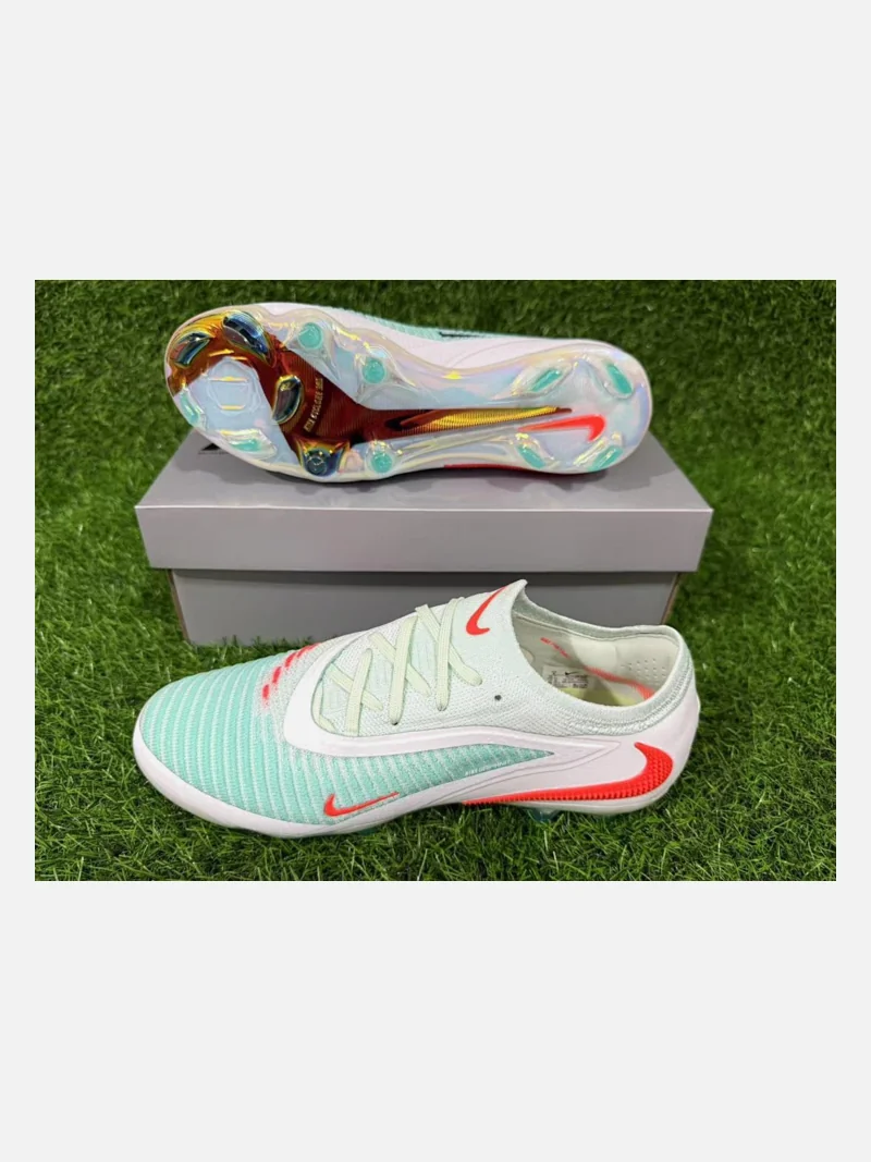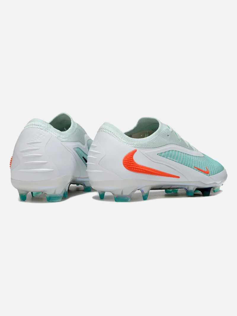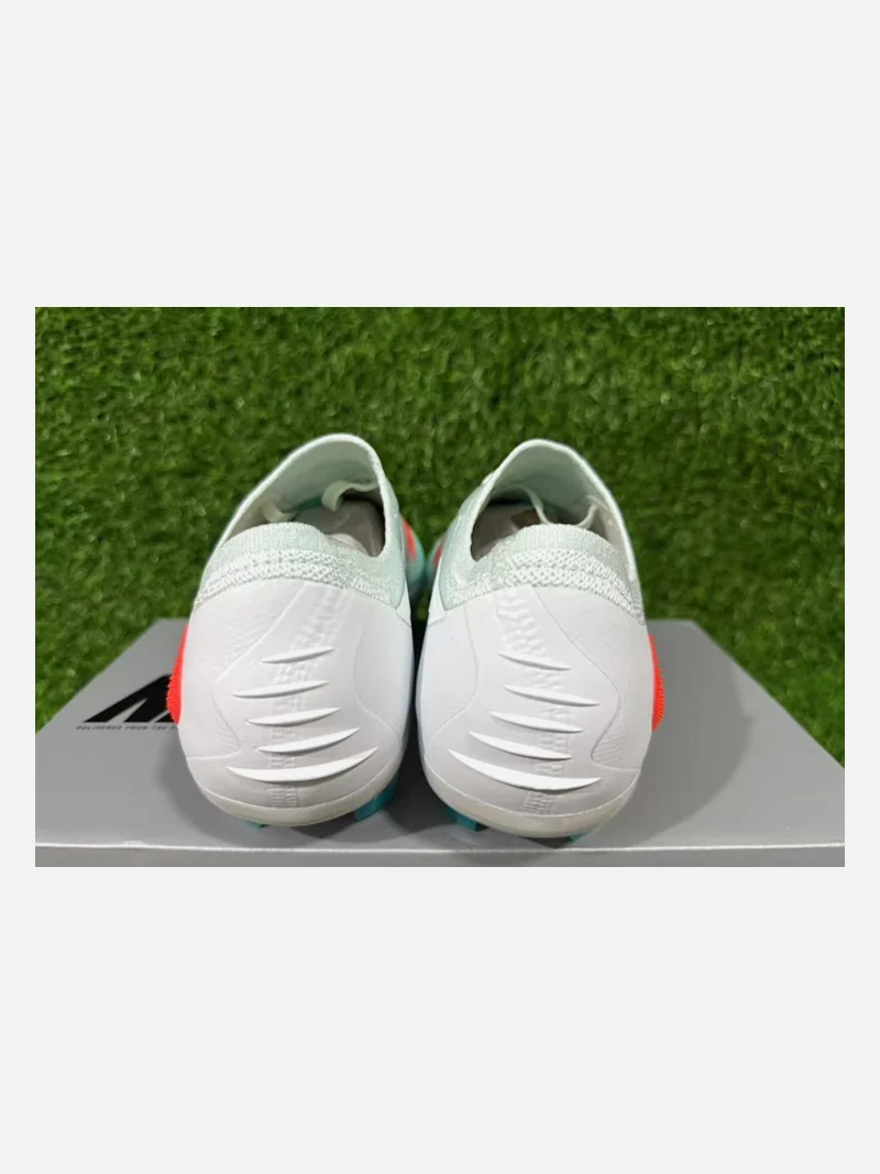 Low-collar speed boot with a wrapped fit that locks your midfoot in place. White, mint, and orange colourway sits sharp on firm ground.