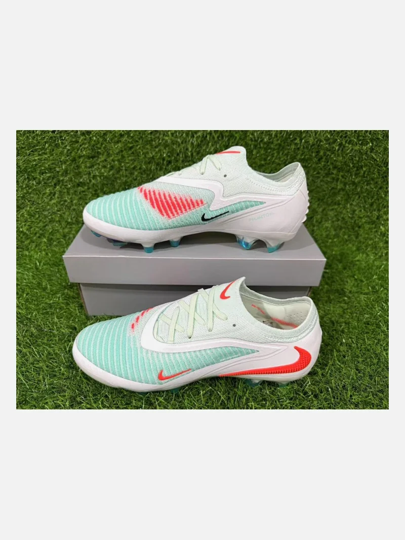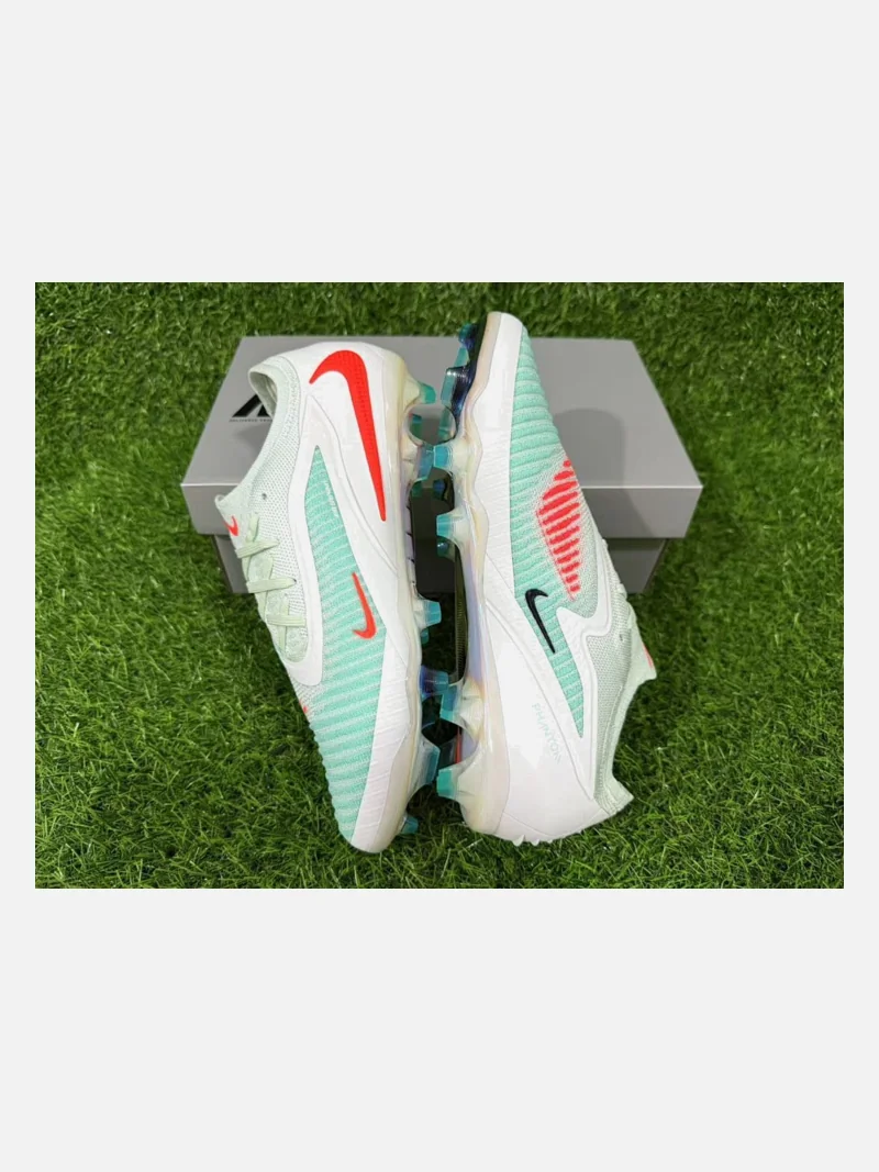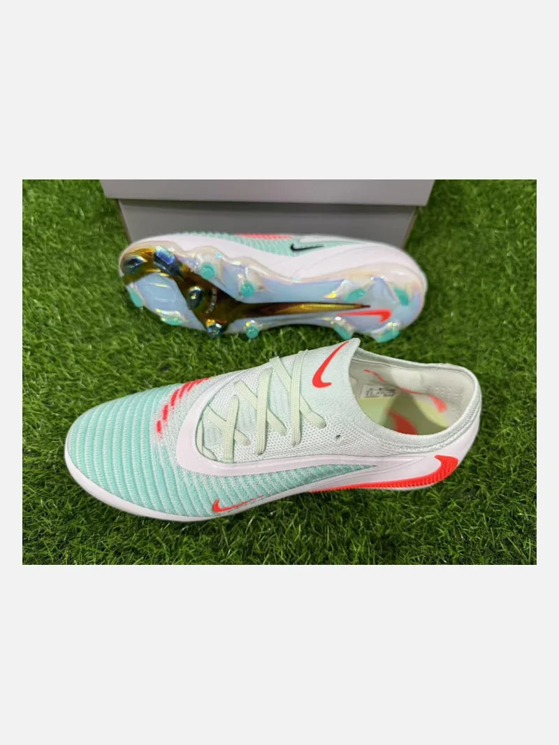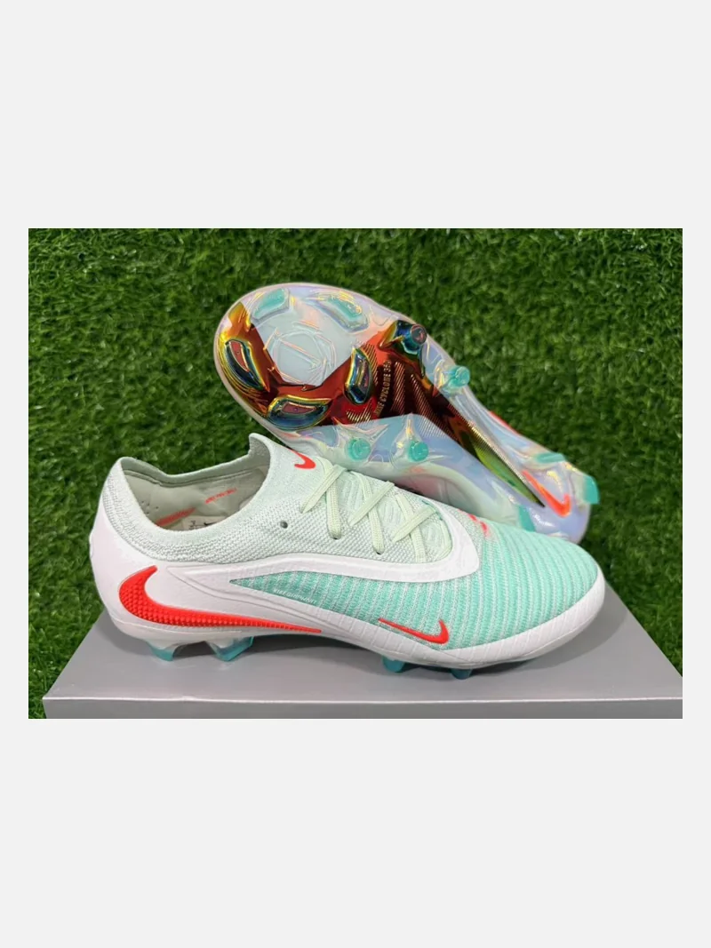 Low-collar speed boot with a wrapped fit that locks your midfoot in place. White, mint, and orange colourway sits sharp on firm ground.