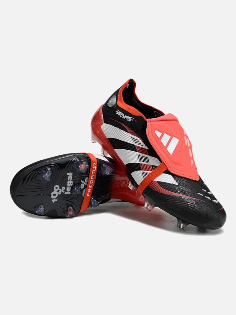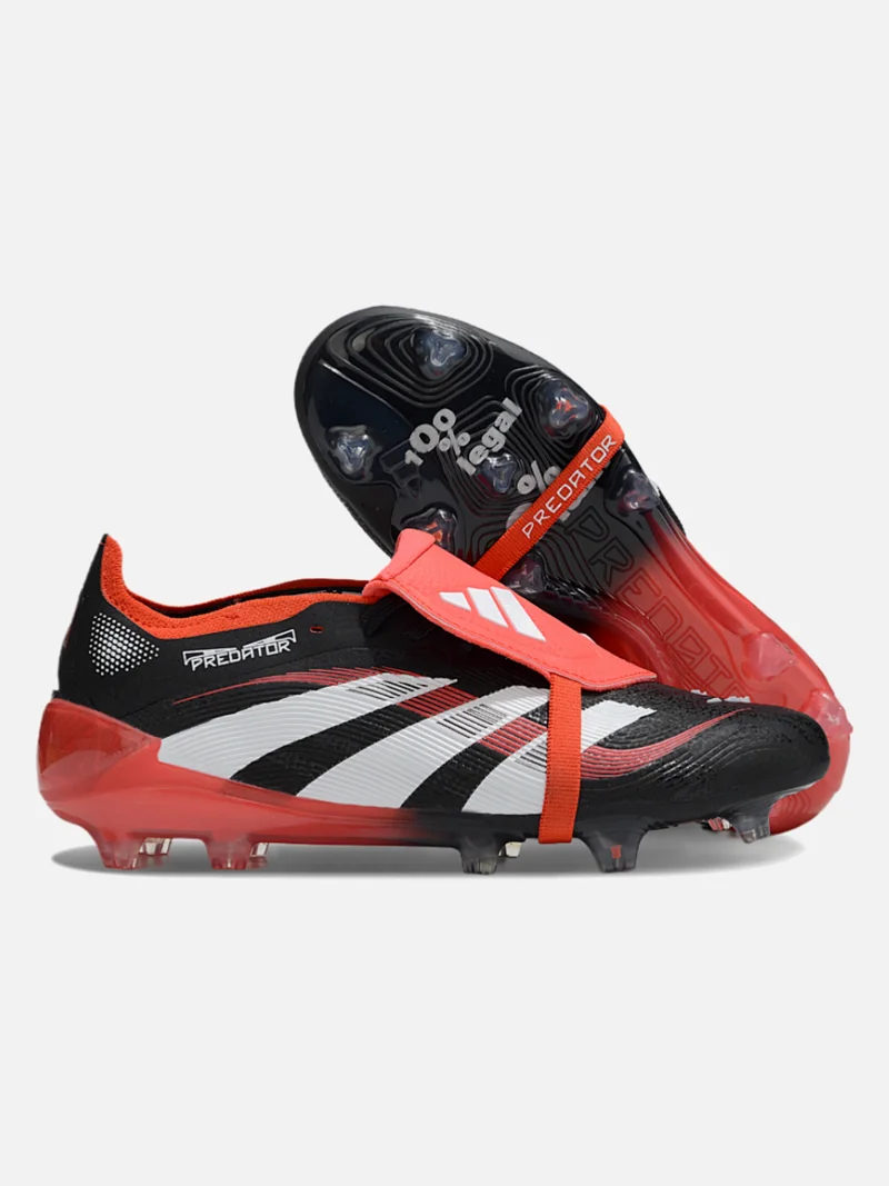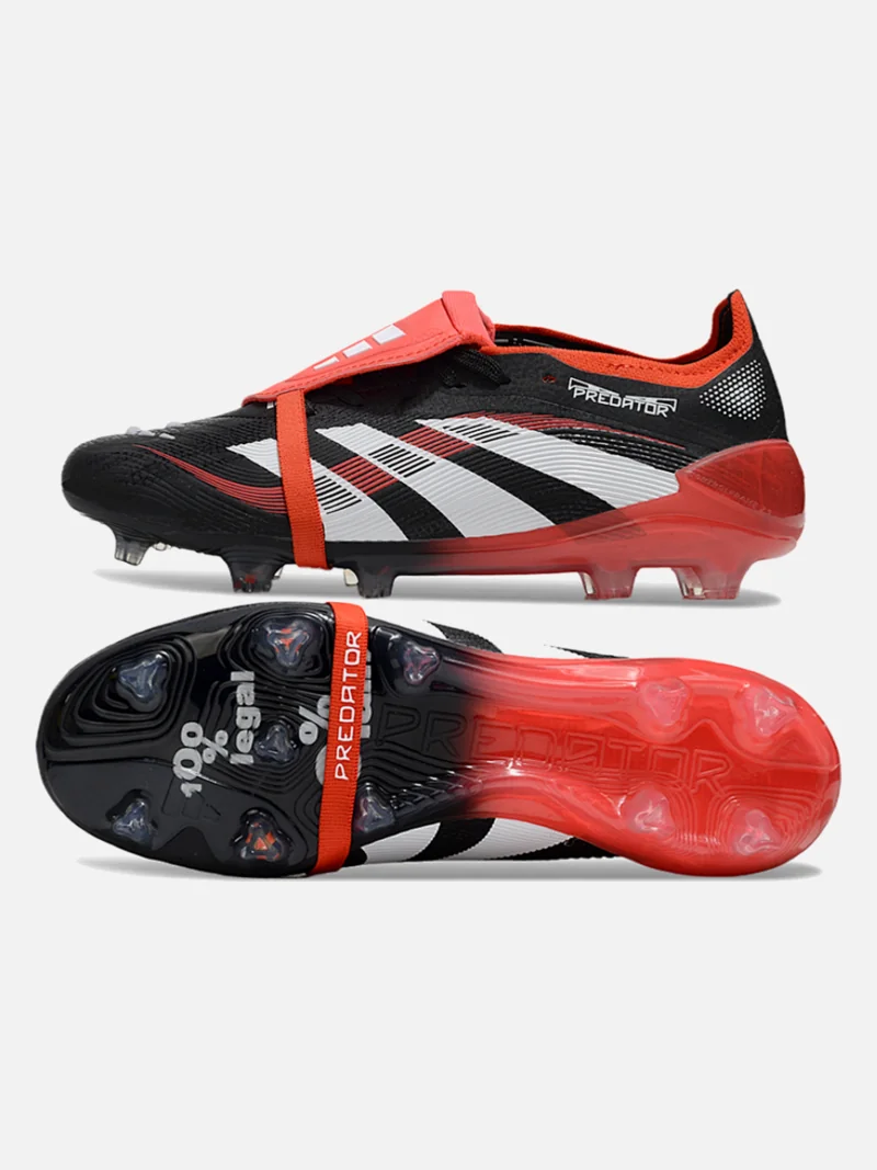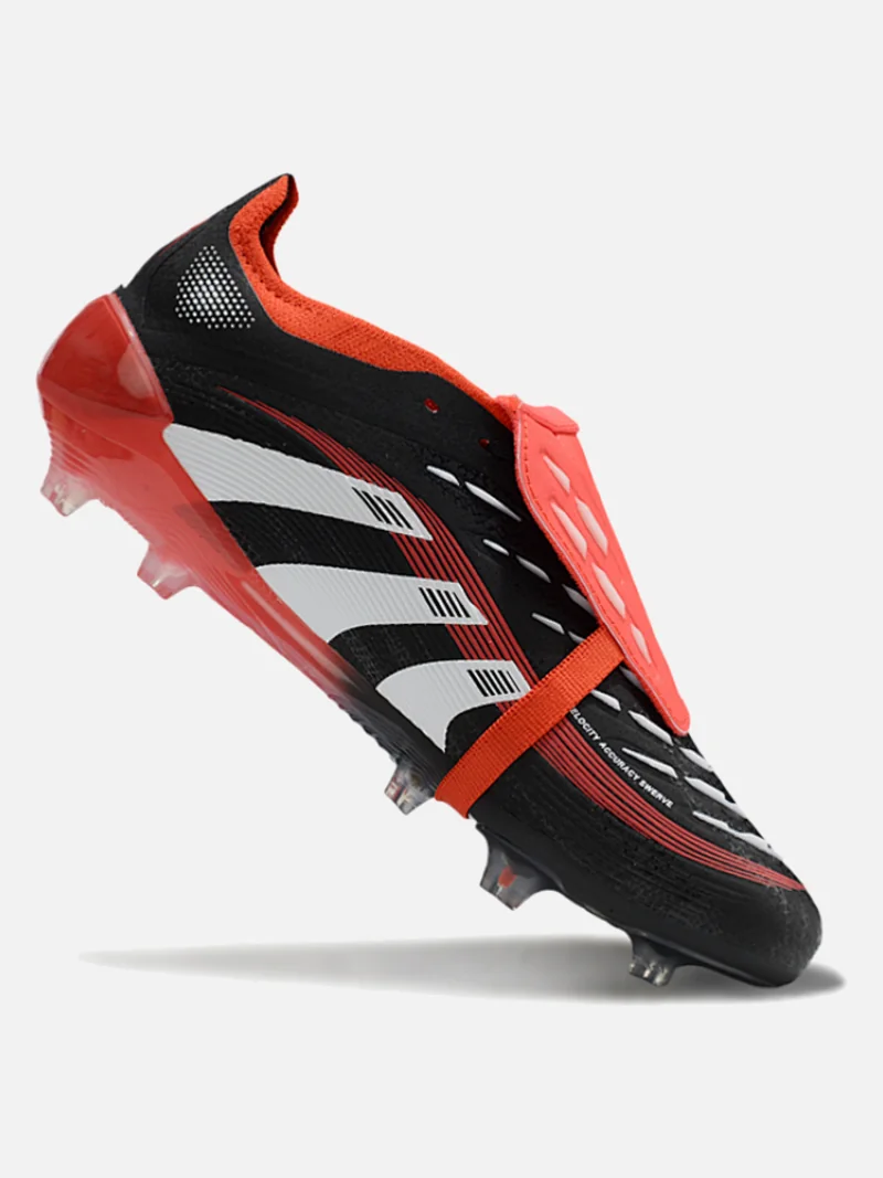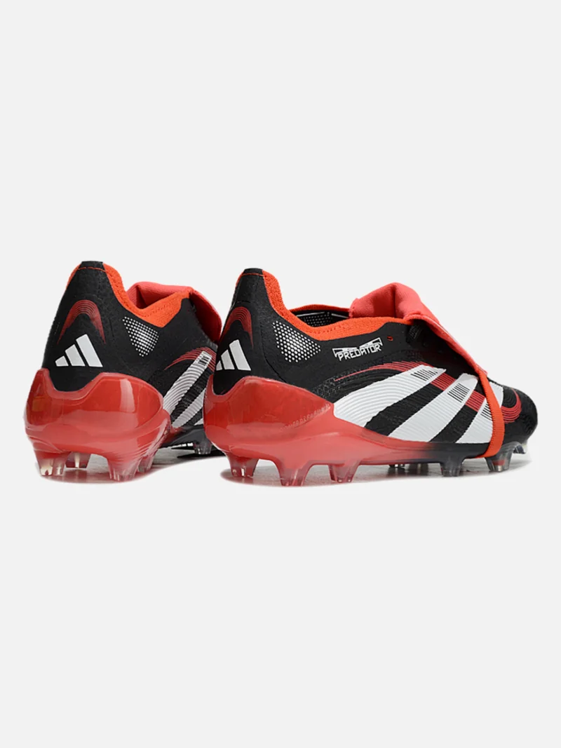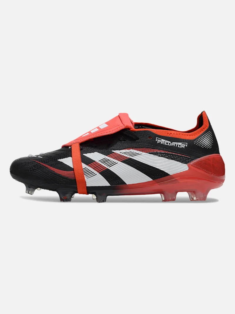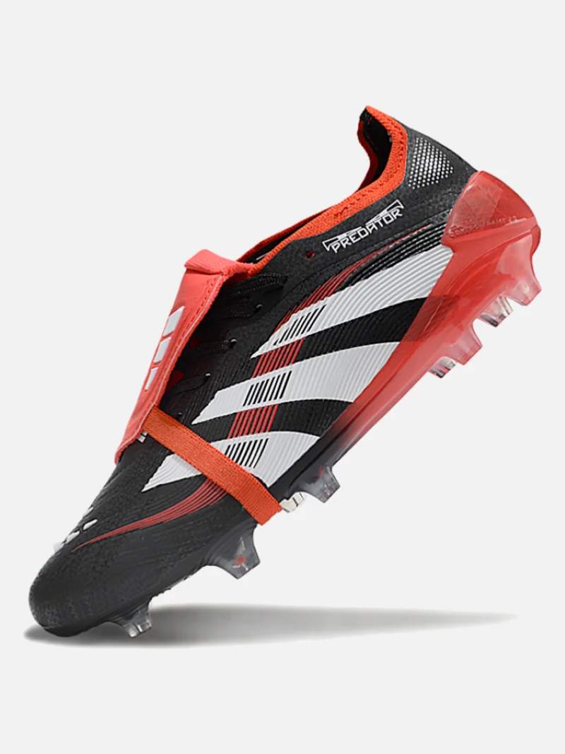 Adidas Predator with the fold-over tongue that locks your foot in place and kills spin on dead-ball strikes. Black, white, and red colourway sits clean on firm ground.
