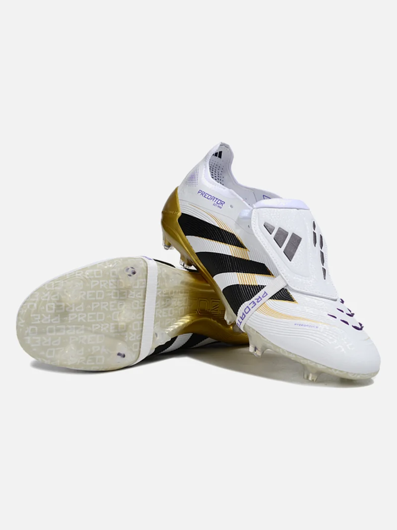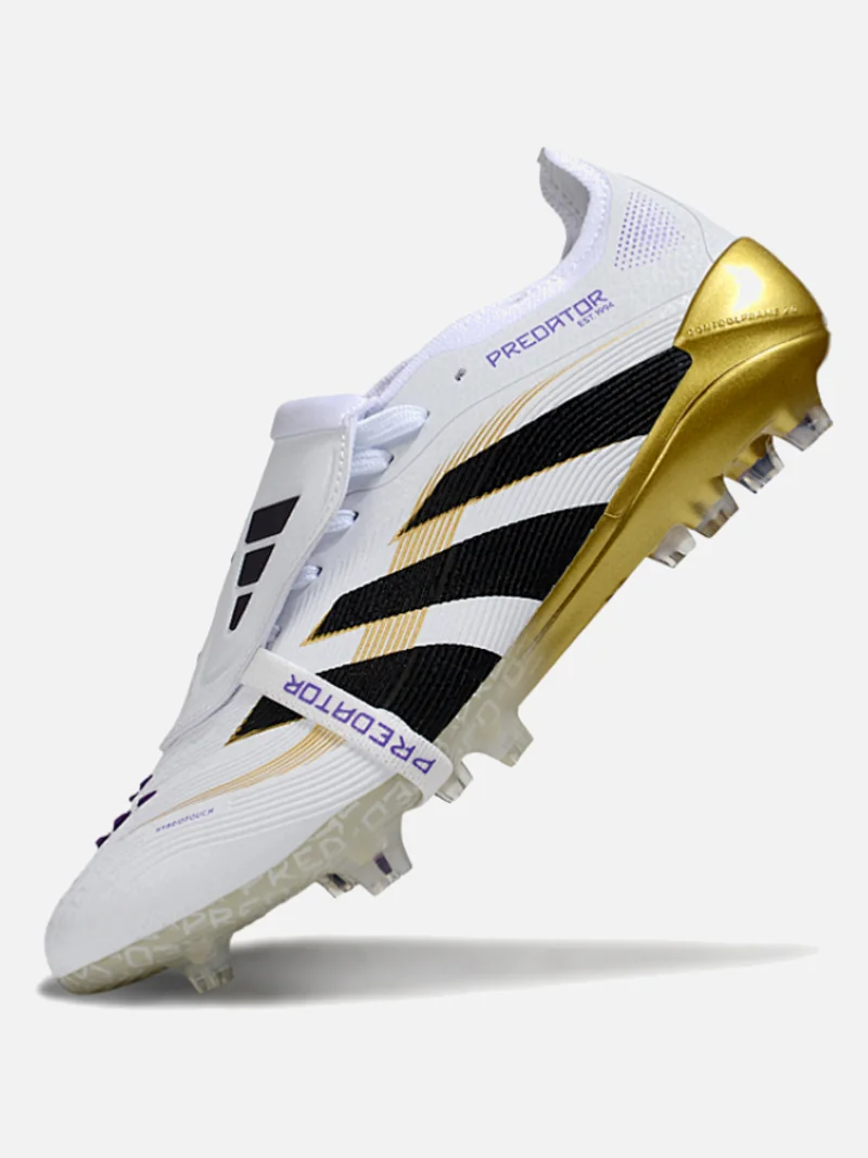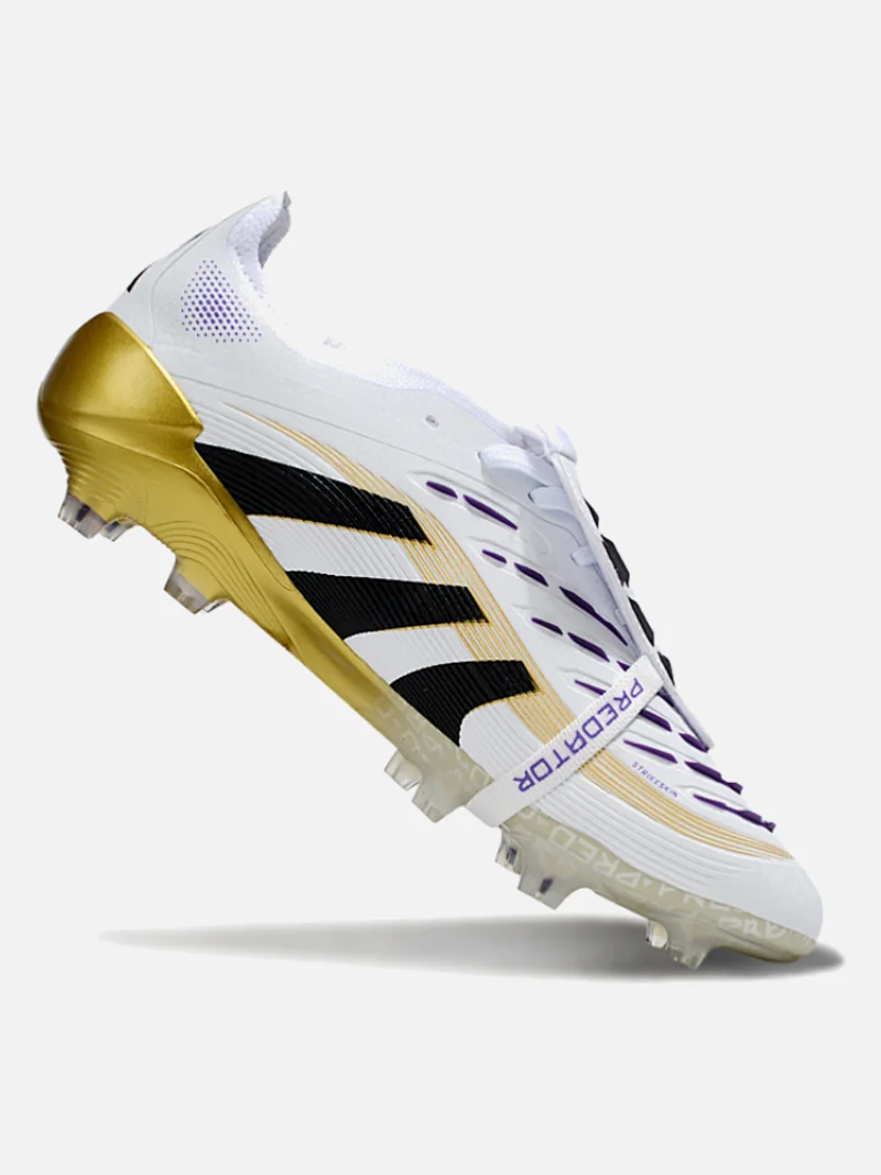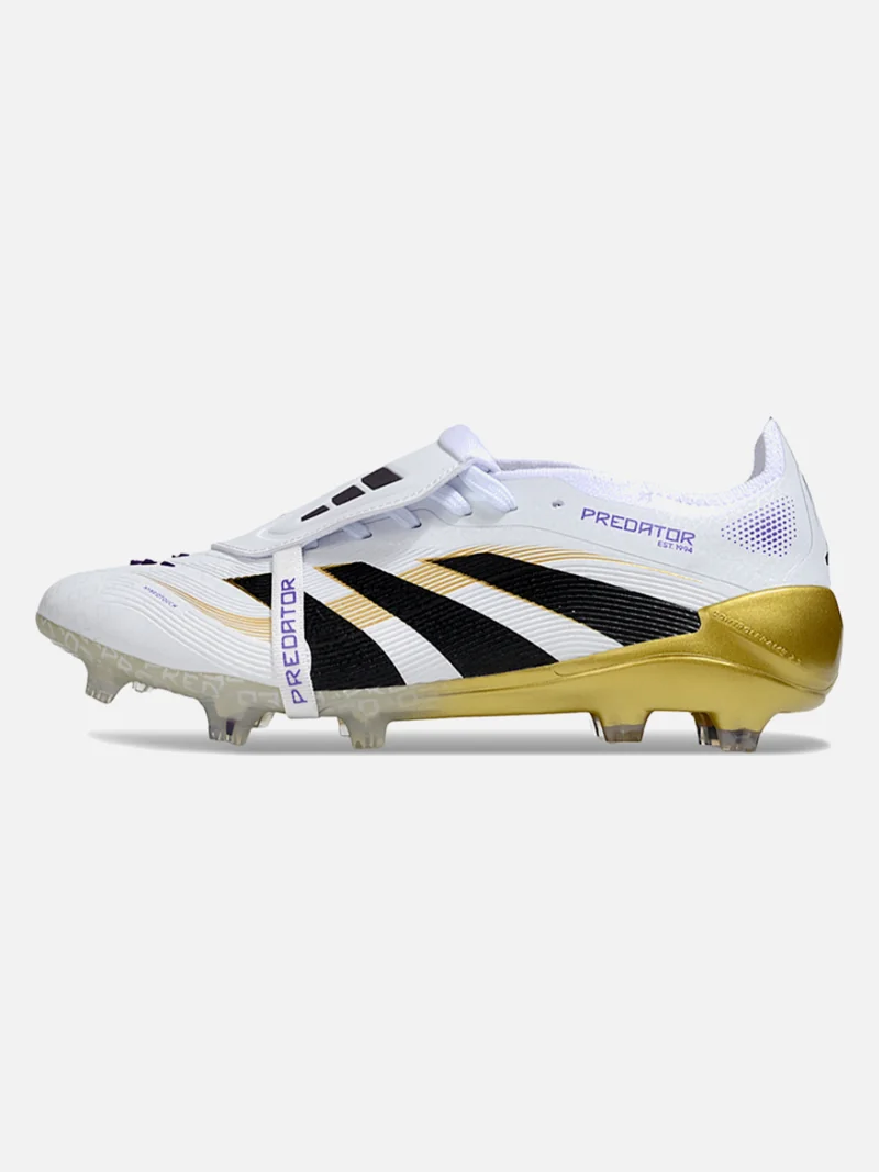 Adidas Predator with a fold-over tongue that locks your foot in place. White, black, gold, and violet colorway on firm ground.