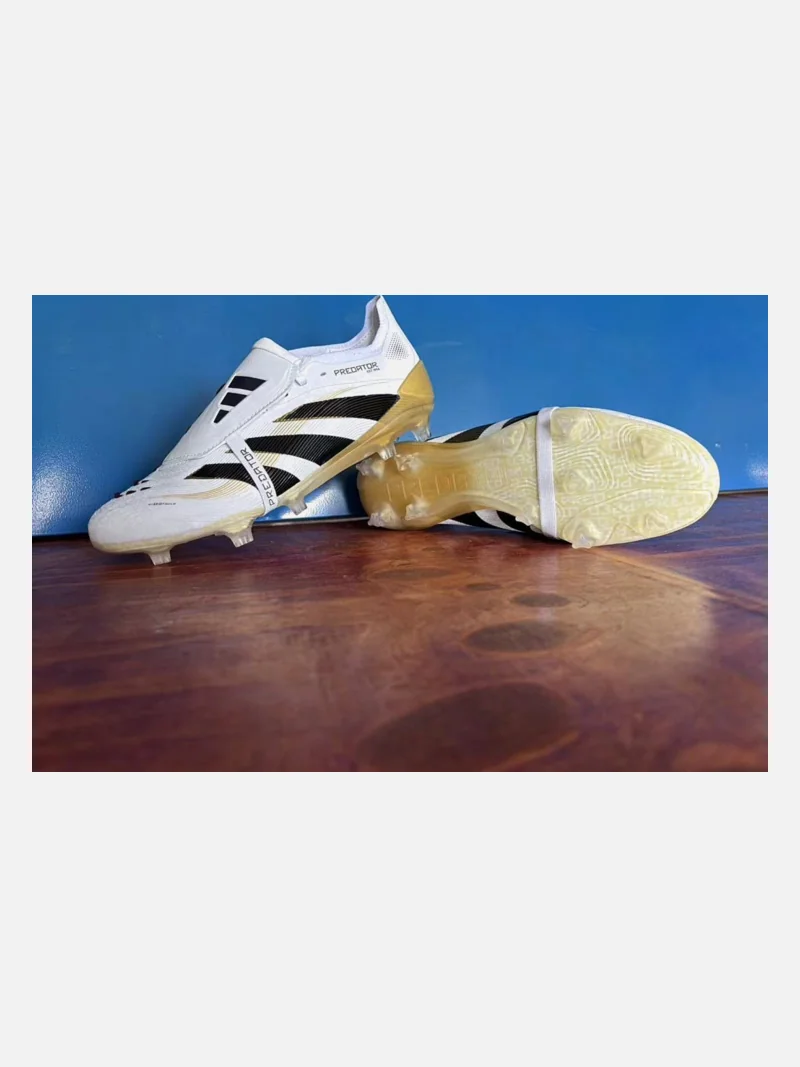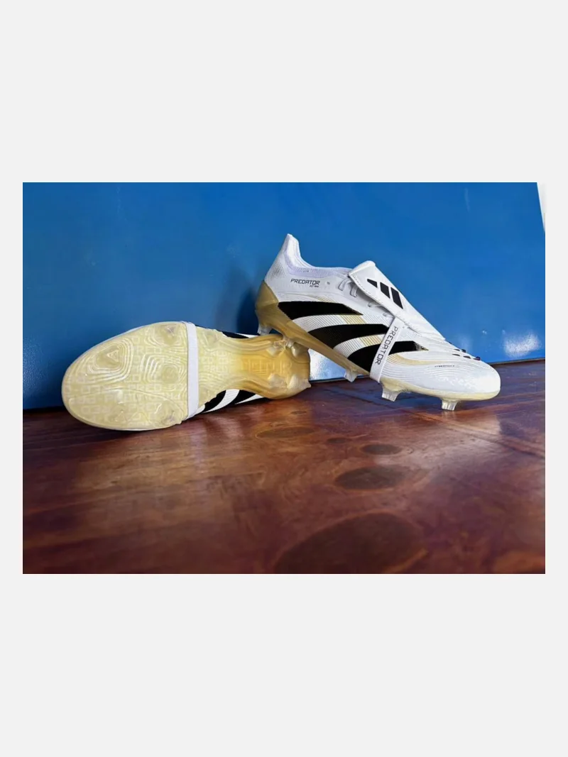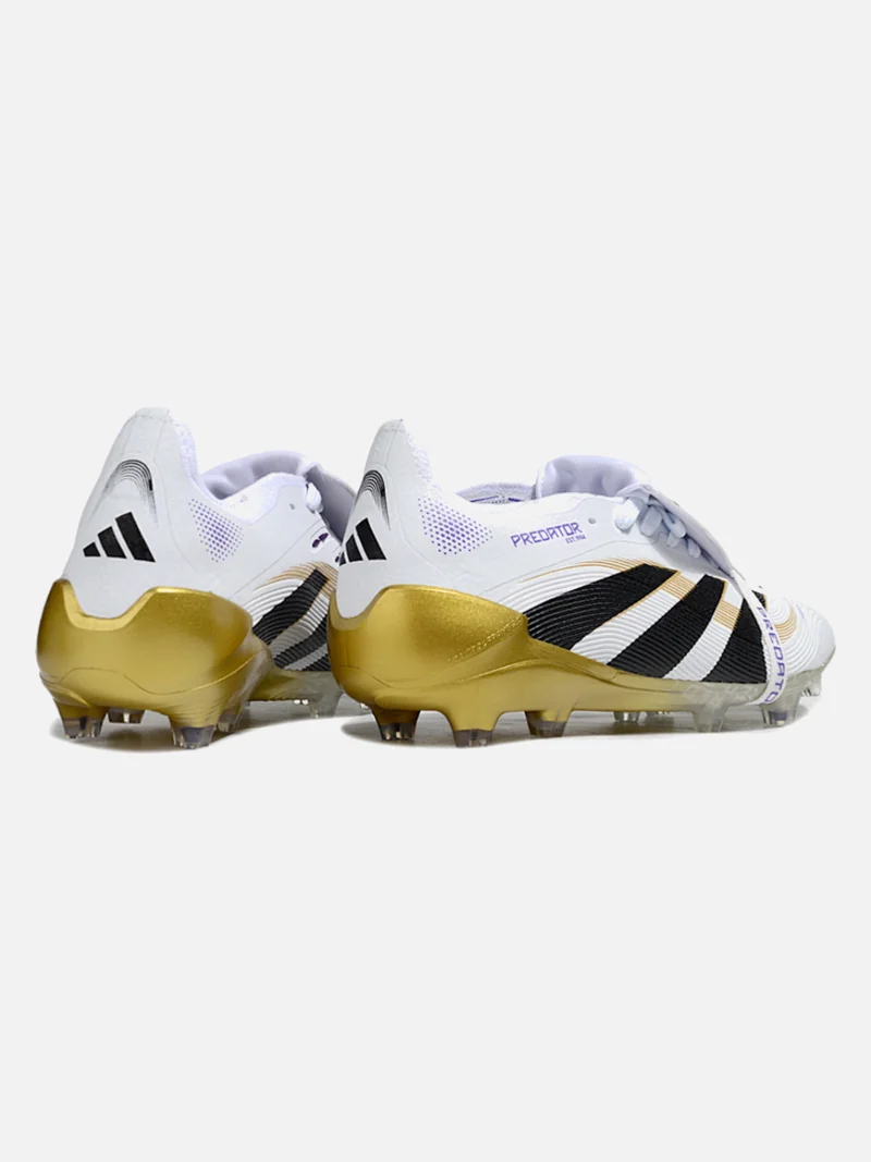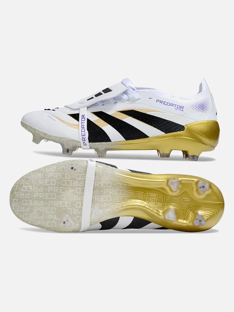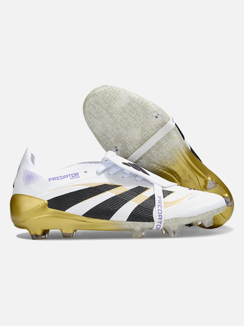 Adidas Predator with a fold-over tongue that locks your foot in place. White, black, gold, and violet colorway on firm ground.